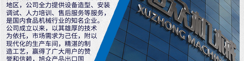 廣州旭眾食品機械有限公司是一家集科研開發(fā),生產設計,營銷服務為一體的現(xiàn)代化生產企業(yè)?,F(xiàn)代化生產車間,精湛制造技術,所產機械歷經市場重重考驗,不斷贏得海內外客戶的贊譽。