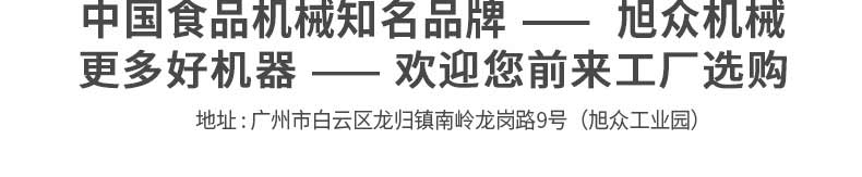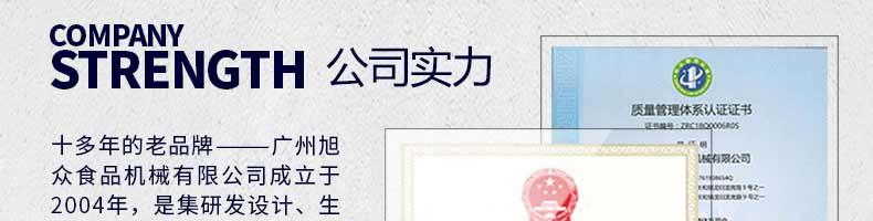 廣州旭眾食品機(jī)械有限公司是一家集科研開發(fā),生產(chǎn)設(shè)計,營銷服務(wù)為一體的現(xiàn)代化生產(chǎn)企業(yè)。現(xiàn)代化生產(chǎn)車間,精湛制造技術(shù),所產(chǎn)機(jī)械歷經(jīng)市場重重考驗,不斷贏得海內(nèi)外客戶的贊譽(yù)。