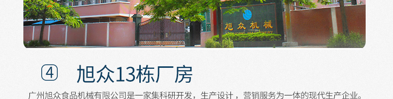 廣州旭眾食品機械有限公司是一家集科研開發(fā),生產(chǎn)設(shè)計,營銷服務(wù)為一體的現(xiàn)代化生產(chǎn)企業(yè)?,F(xiàn)代化生產(chǎn)車間,精湛制造技術(shù),所產(chǎn)機械歷經(jīng)市場重重考驗,不斷贏得海內(nèi)外客戶的贊譽。