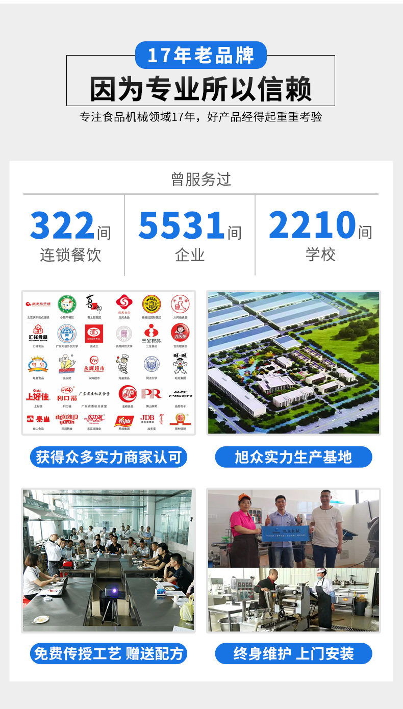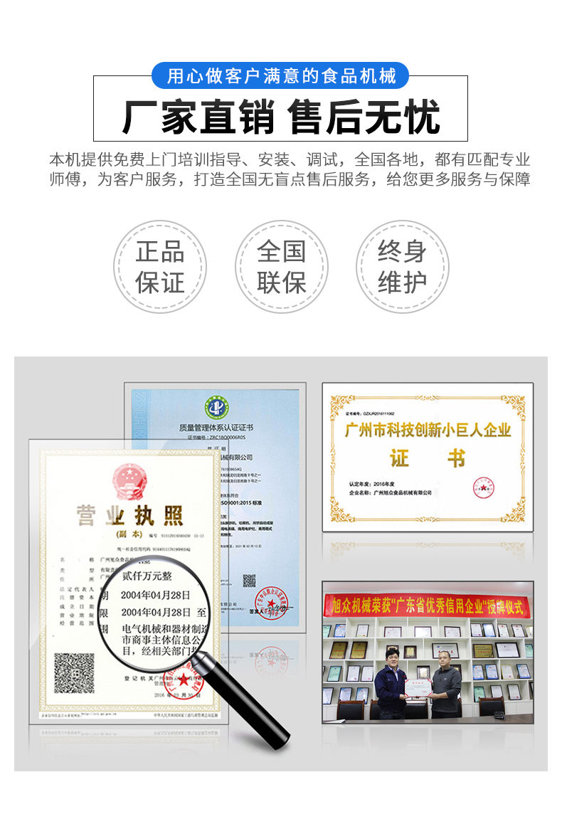 廣州旭眾食品機(jī)械有限公司是一家集科研開發(fā),生產(chǎn)設(shè)計(jì),營銷服務(wù)為一體的現(xiàn)代化生產(chǎn)企業(yè)?,F(xiàn)代化生產(chǎn)車間,精湛制造技術(shù),所產(chǎn)機(jī)械歷經(jīng)市場(chǎng)重重考驗(yàn),不斷贏得海內(nèi)外客戶的贊譽(yù)。