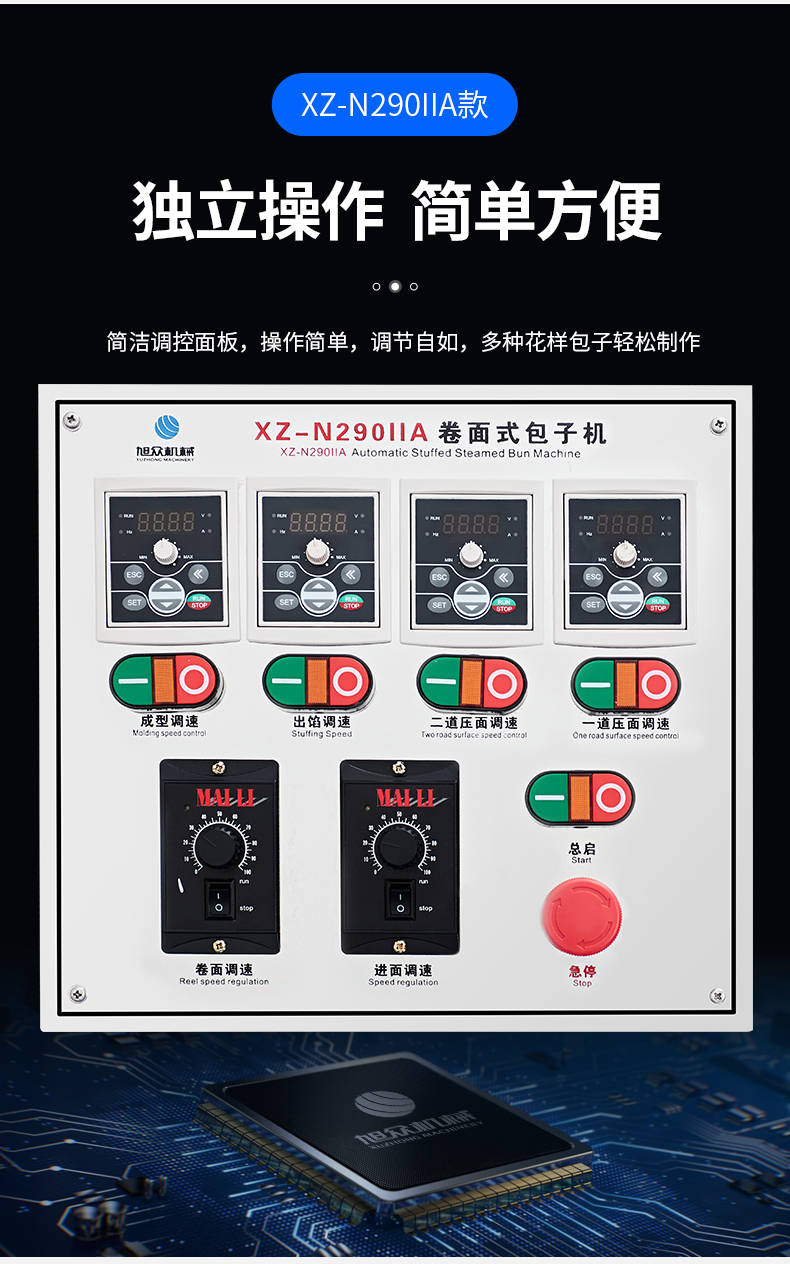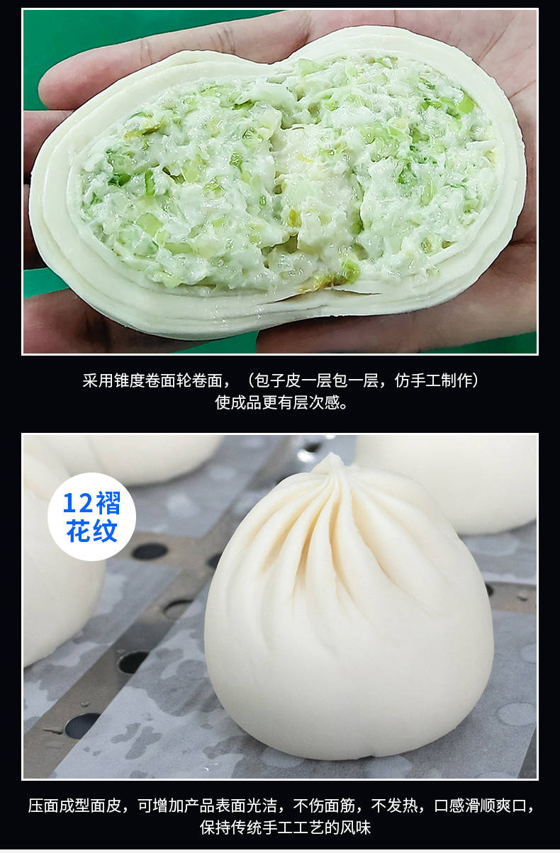 XZ-N290IIA卷面式包子機,壓面成型面皮,卷面方式包餡。仿手工捏花、一次成型、表面光滑、口感勁道。面餡可調(diào)、制品多樣。產(chǎn)品重量精度高,規(guī)格,大小,面皮的厚度皆可調(diào)控。