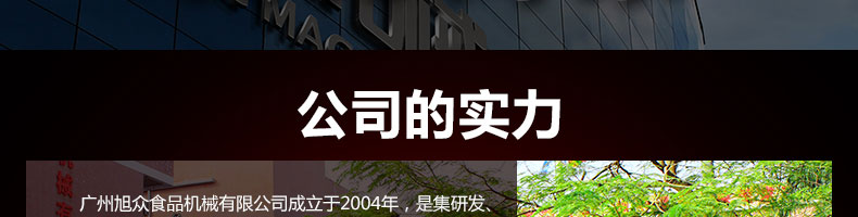 廣州旭眾食品機(jī)械有限公司是一家集科研開(kāi)發(fā),生產(chǎn)設(shè)計(jì),營(yíng)銷(xiāo)服務(wù)為一體的現(xiàn)代化生產(chǎn)企業(yè)。現(xiàn)代化生產(chǎn)車(chē)間,精湛制造技術(shù),所產(chǎn)機(jī)械歷經(jīng)市場(chǎng)重重考驗(yàn),不斷贏得海內(nèi)外客戶(hù)的贊譽(yù)。