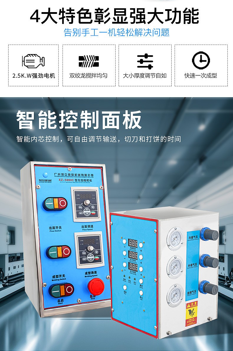XZ-5000C糍粑機,軟糯細膩、省時省力,不銹鋼糍粑機。智能控制面板,智能內(nèi)芯控制,可自由調(diào)節(jié)輸送,切刀和打餅的時間。拍扁刀切功能,具備氣缸打餅以及氣缸切刀的功能、又薄又準確、可制作長條形的產(chǎn)品。