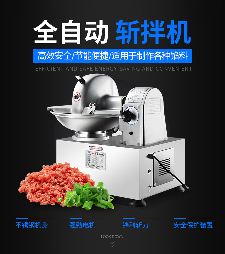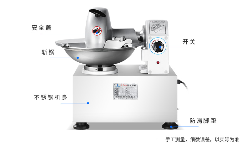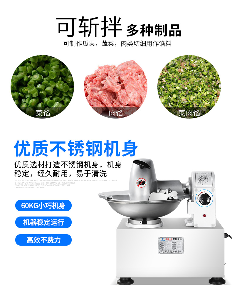 SZ-5型斬拌機,全自動斬拌機,高效安全、節(jié)能便捷、適用于制作各種餡料。可斬拌多種制品,可制作瓜果,蔬菜,肉類切細用作餡料。優(yōu)質選材打造不銹鋼機身,機身穩(wěn)定,經久耐用,易于清洗。