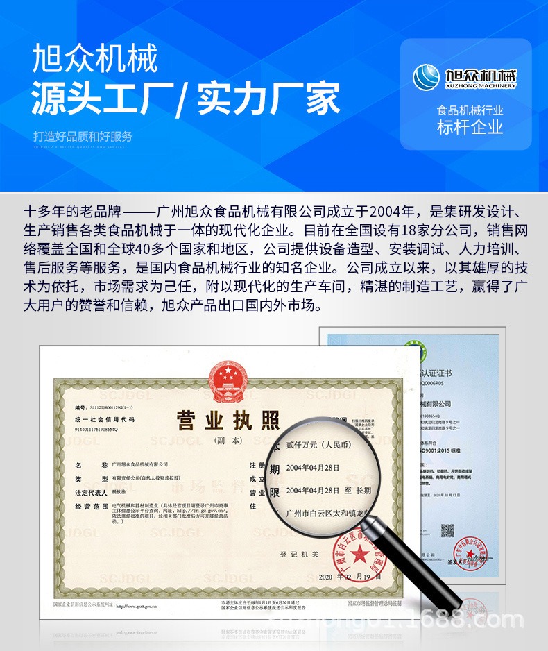 廣州旭眾食品機械有限公司是一家集科研開發(fā),生產(chǎn)設(shè)計,營銷服務為一體的現(xiàn)代化生產(chǎn)企業(yè)?,F(xiàn)代化生產(chǎn)車間,精湛制造技術(shù),所產(chǎn)機械歷經(jīng)市場重重考驗,不斷贏得海內(nèi)外客戶的贊譽。