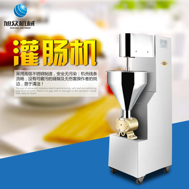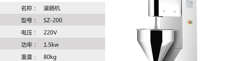 SZ-200灌腸機(jī),適合灌制各種香腸、紅腸、臘腸及糊狀制品。本機(jī)使用敞開(kāi)式不銹鋼料斗,適用于連續(xù)添加物料;與灌裝手接觸部件全部采用優(yōu)質(zhì)不銹鋼制作以防生銹;該機(jī)自動(dòng)貨程度高,技術(shù)先進(jìn)、性能穩(wěn)定、操作簡(jiǎn)便、工作效率高,具有不破壞物料成份,保質(zhì)、保鮮等特點(diǎn)。