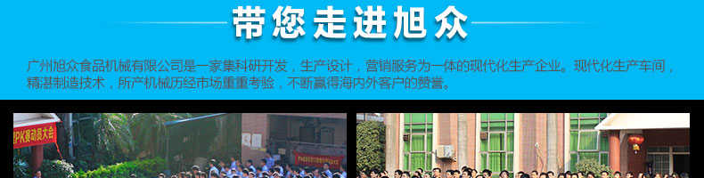 廣州旭眾食品機(jī)械有限公司是一家集科研開發(fā),生產(chǎn)設(shè)計,營銷服務(wù)為一體的現(xiàn)代化生產(chǎn)企業(yè)?,F(xiàn)代化生產(chǎn)車間,精湛制造技術(shù),所產(chǎn)機(jī)械歷經(jīng)市場重重考驗,不斷贏得海內(nèi)外客戶的贊譽(yù)。