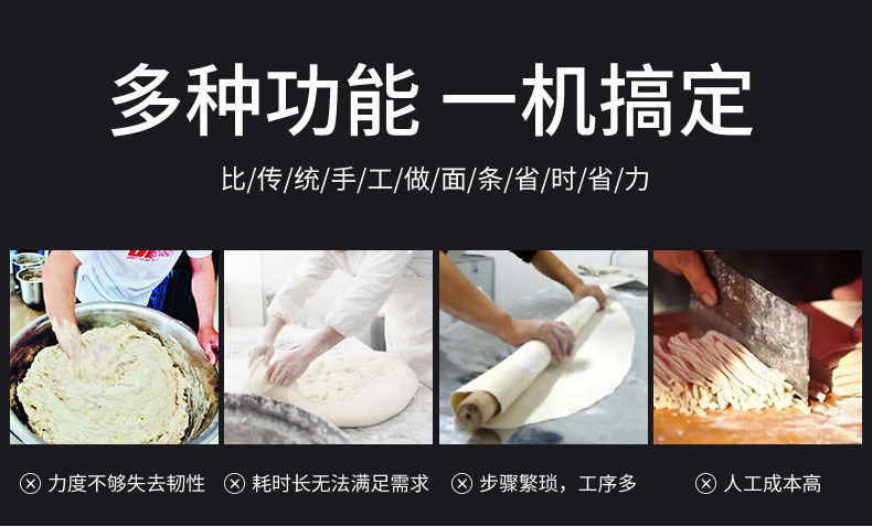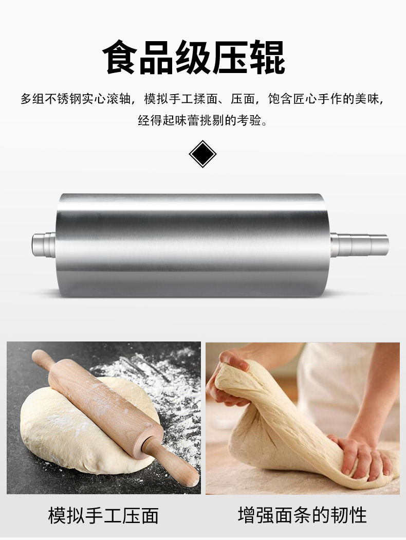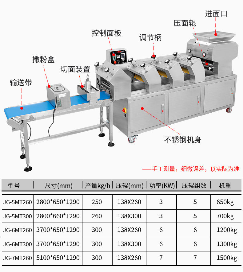 JG-7MT300面條機,多種功能一機搞定比傳統(tǒng)手工做面條,省時省力。可以做什么鮮面、蔬菜面、掛面、圓面、寬面、刀削面、波浪面等。不同的面刀可以做出不同形狀的面食做工細,實用又方便,出面均勻,成型漂亮。