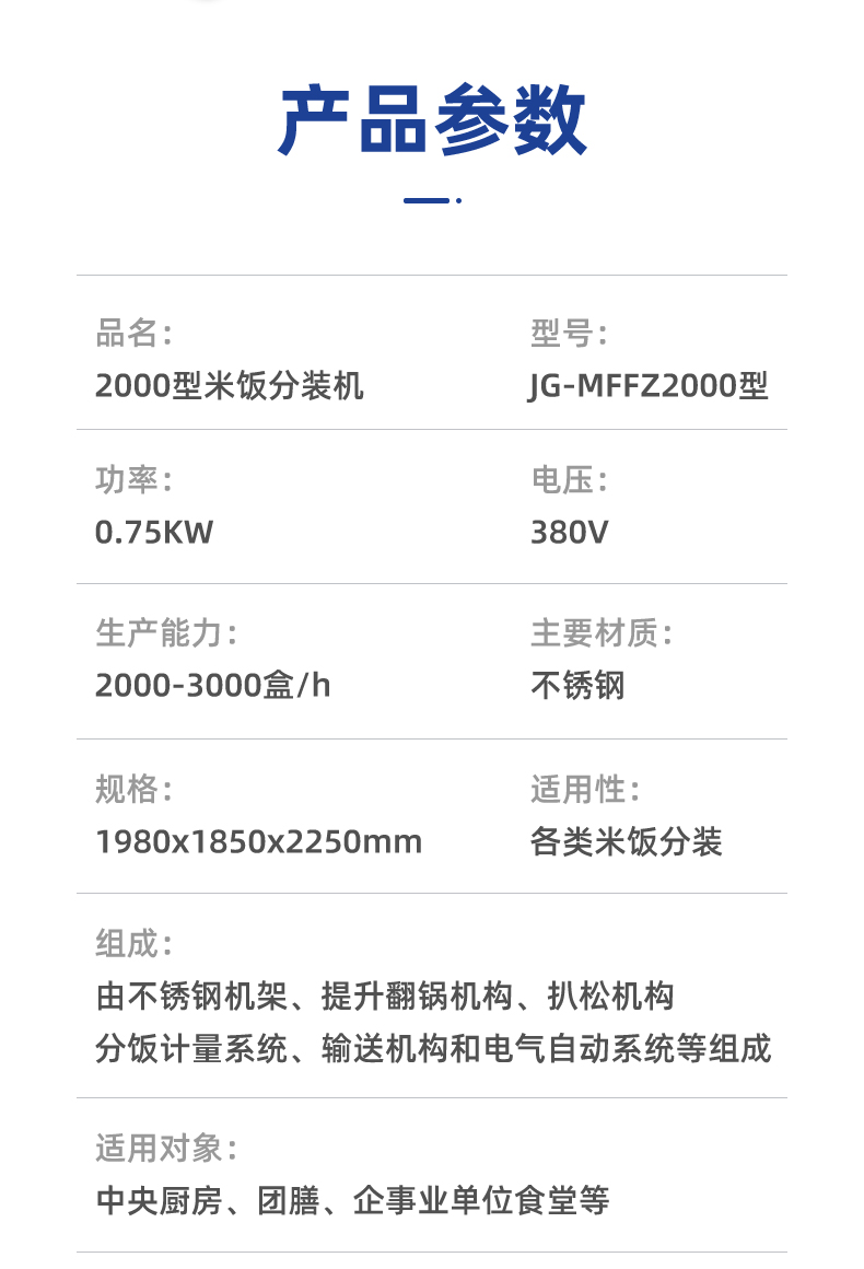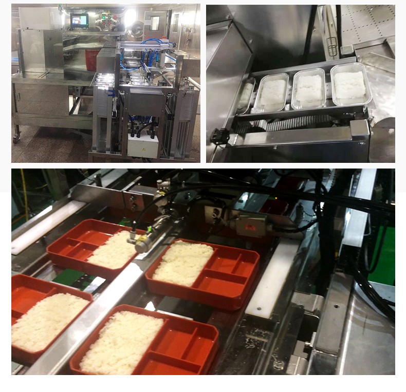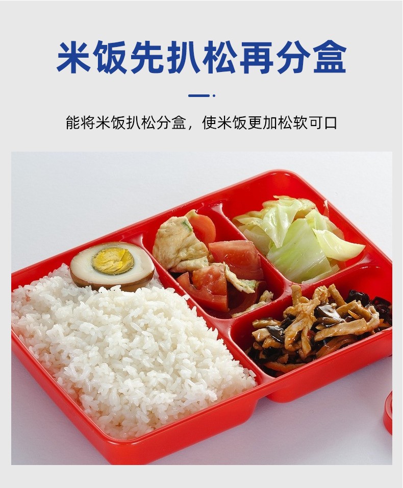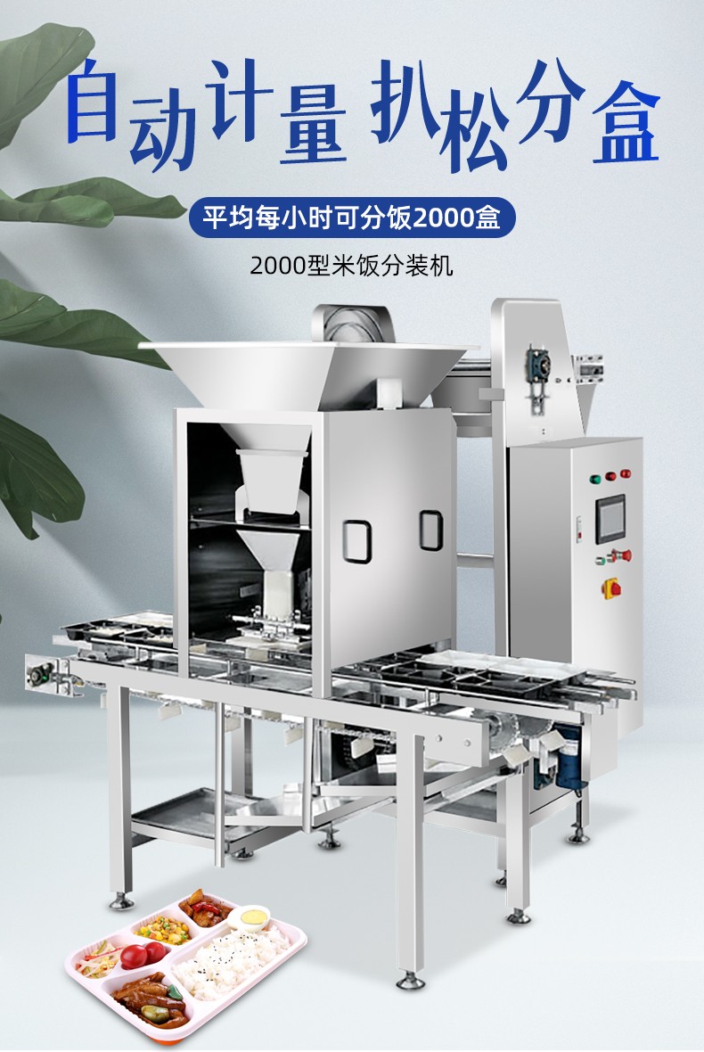 米飯分裝機(jī),適用多場(chǎng)合大型米飯加工中心、快餐公司、大型配餐中心企事業(yè)單位、學(xué)校食堂、釀造企業(yè)。米飯定量分裝,自動(dòng)完成分飯和計(jì)量,精準(zhǔn)飯量。米飯先扒松再分盒,能將米飯扒松分盒,使米飯更加松軟可口。