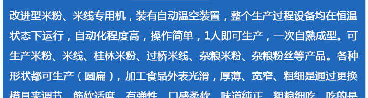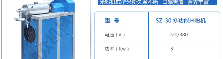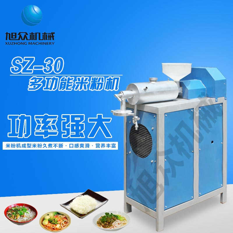 SZ-30米粉機(jī),生產(chǎn)多樣性可生產(chǎn)米粉、米線(xiàn)、粉絲、粉條、、年糕、玉米面條、各種雜糧粉絲、各種面條、雜糧面條、彩色面條以及以紅薯、玉米、大豆、蠶豆等制成淀粉為原料的等多種食品而且每種食品厚薄、粗細(xì)等規(guī)格可根據(jù)需要任意調(diào)整。