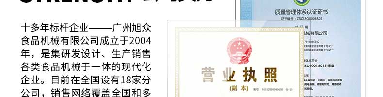 廣州旭眾食品機(jī)械有限公司是一家集科研開發(fā),生產(chǎn)設(shè)計,營銷服務(wù)為一體的現(xiàn)代化生產(chǎn)企業(yè)?,F(xiàn)代化生產(chǎn)車間,精湛制造技術(shù),所產(chǎn)機(jī)械歷經(jīng)市場重重考驗,不斷贏得海內(nèi)外客戶的贊譽(yù)。