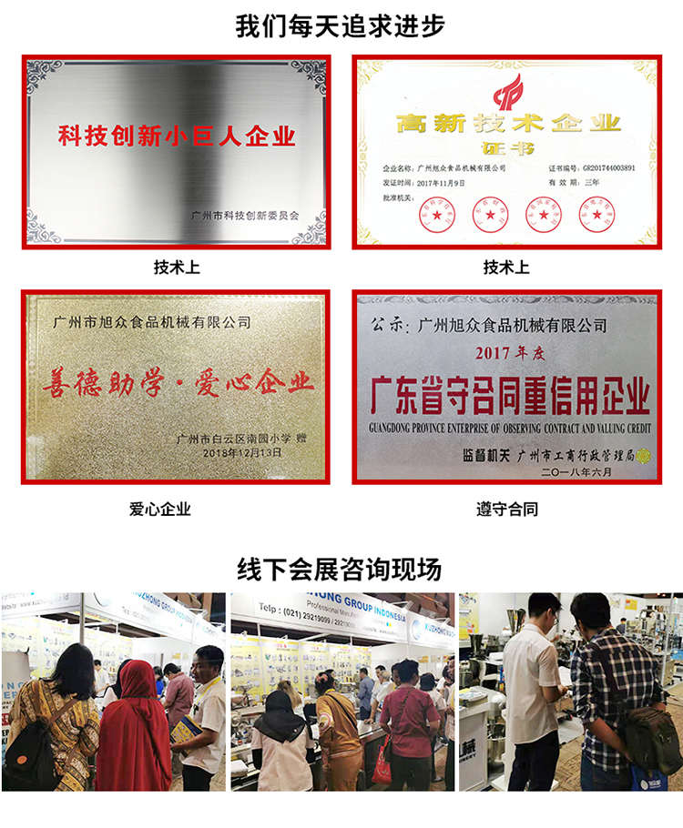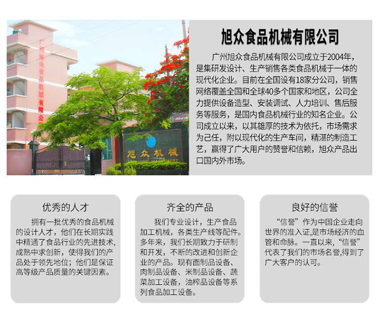 廣州旭眾食品機(jī)械有限公司是一家集科研開(kāi)發(fā),生產(chǎn)設(shè)計(jì),營(yíng)銷(xiāo)服務(wù)為一體的現(xiàn)代化生產(chǎn)企業(yè)。現(xiàn)代化生產(chǎn)車(chē)間,精湛制造技術(shù),所產(chǎn)機(jī)械歷經(jīng)市場(chǎng)重重考驗(yàn),不斷贏得海內(nèi)外客戶(hù)的贊譽(yù)。