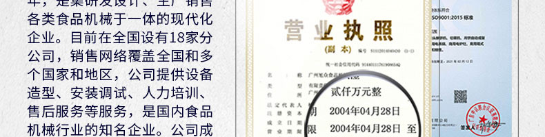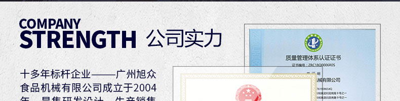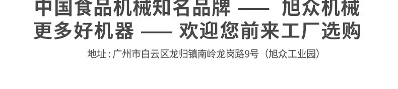 廣州旭眾食品機械有限公司是一家集科研開發(fā),生產設計,營銷服務為一體的現(xiàn)代化生產企業(yè)?,F(xiàn)代化生產車間,精湛制造技術,所產機械歷經市場重重考驗,不斷贏得海內外客戶的贊譽。