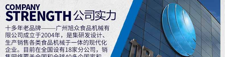 廣州旭眾食品機(jī)械有限公司是一家集科研開發(fā),生產(chǎn)設(shè)計(jì),營銷服務(wù)為一體的現(xiàn)代化生產(chǎn)企業(yè)?,F(xiàn)代化生產(chǎn)車間,精湛制造技術(shù),所產(chǎn)機(jī)械歷經(jīng)市場重重考驗(yàn),不斷贏得海內(nèi)外客戶的贊譽(yù)。