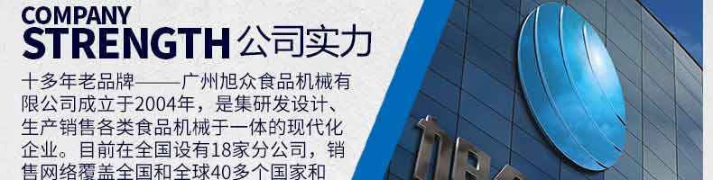 廣州旭眾食品機(jī)械有限公司是一家集科研開(kāi)發(fā),生產(chǎn)設(shè)計(jì),營(yíng)銷服務(wù)為一體的現(xiàn)代化生產(chǎn)企業(yè)?,F(xiàn)代化生產(chǎn)車間,精湛制造技術(shù),所產(chǎn)機(jī)械歷經(jīng)市場(chǎng)重重考驗(yàn),不斷贏得海內(nèi)外客戶的贊譽(yù)。
