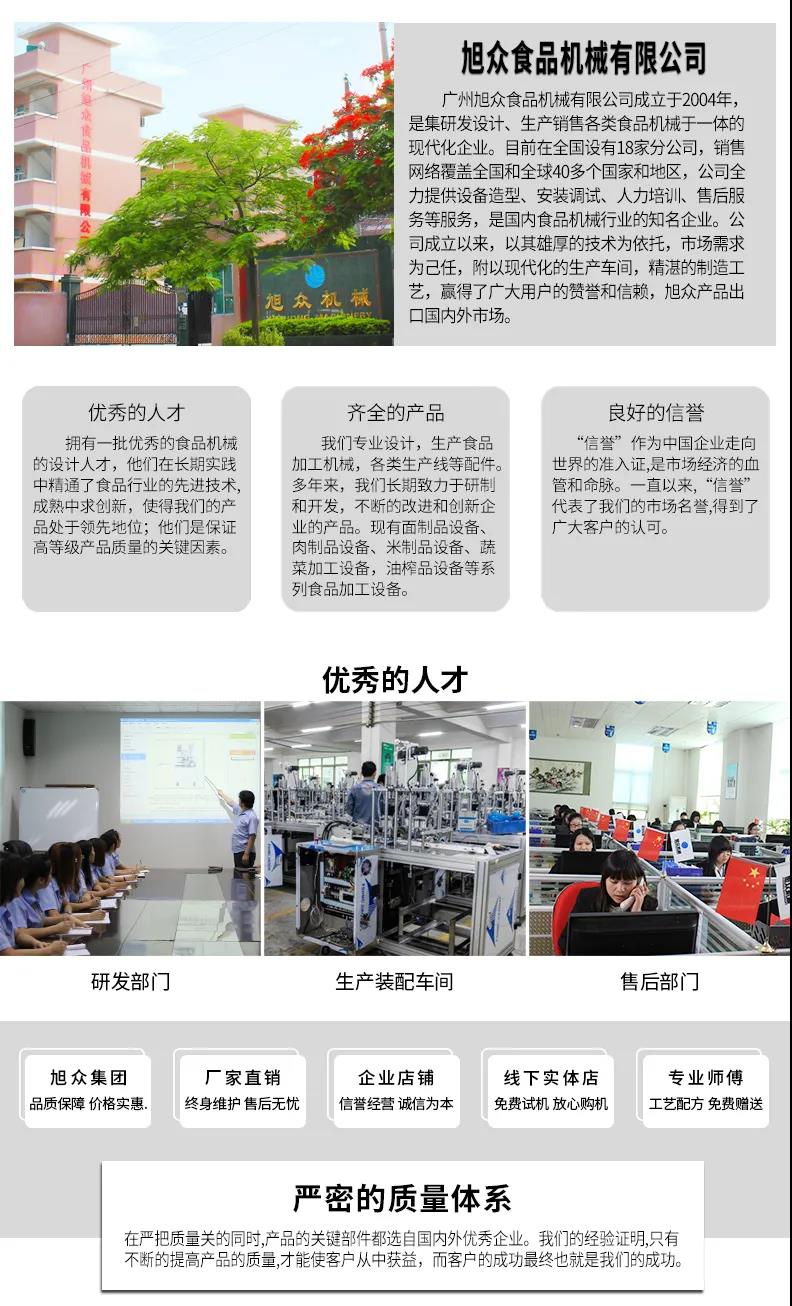 廣州旭眾食品機(jī)械有限公司是一家集科研開發(fā),生產(chǎn)設(shè)計,營銷服務(wù)為一體的現(xiàn)代化生產(chǎn)企業(yè)?,F(xiàn)代化生產(chǎn)車間,精湛制造技術(shù),所產(chǎn)機(jī)械歷經(jīng)市場重重考驗,不斷贏得海內(nèi)外客戶的贊譽。