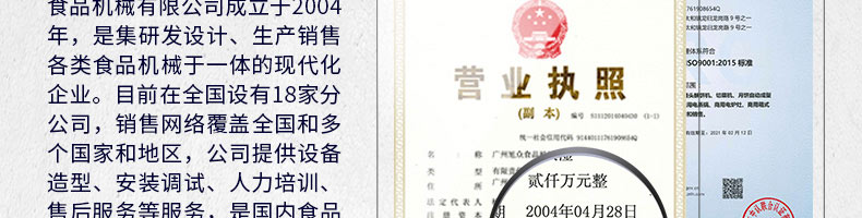 廣州旭眾食品機械有限公司是一家集科研開發(fā),生產設計,營銷服務為一體的現(xiàn)代化生產企業(yè)?,F(xiàn)代化生產車間,精湛制造技術,所產機械歷經市場重重考驗,不斷贏得海內外客戶的贊譽。