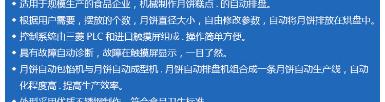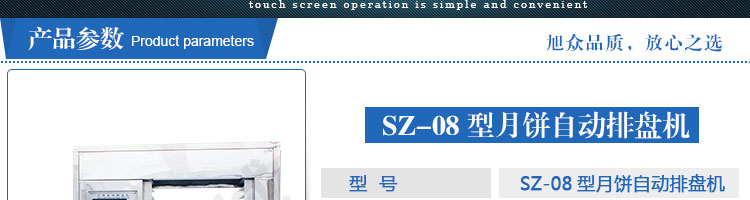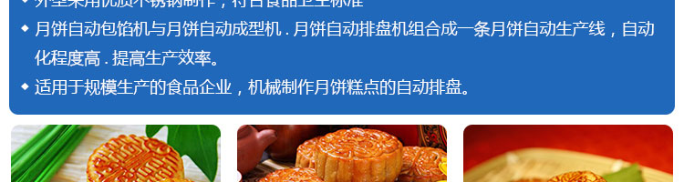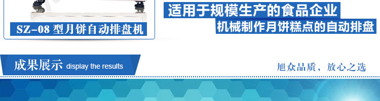 SZ-08型月餅自動(dòng)排盤(pán)機(jī),可同于制作各種月餅。適用于蛋糕房、休閑食品廠(chǎng)、食品加工產(chǎn)、面包房、月餅加工廠(chǎng)、超市、學(xué)校、食堂等各種工作場(chǎng)所??蓾M(mǎn)足不同客戶(hù)群體。免費(fèi)提供工藝技術(shù)。