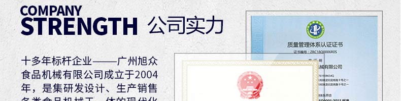 廣州旭眾食品機(jī)械有限公司是一家集科研開(kāi)發(fā),生產(chǎn)設(shè)計(jì),營(yíng)銷服務(wù)為一體的現(xiàn)代化生產(chǎn)企業(yè)。現(xiàn)代化生產(chǎn)車間,精湛制造技術(shù),所產(chǎn)機(jī)械歷經(jīng)市場(chǎng)重重考驗(yàn),不斷贏得海內(nèi)外客戶的贊譽(yù)。