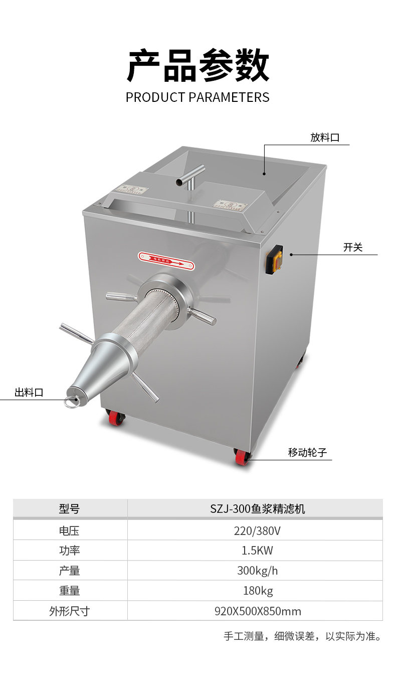 SZJ-300魚漿精濾機,商用創(chuàng)業(yè)魚漿精濾機,用于配套魚肉采肉機進行魚肉過濾雜質(zhì)。節(jié)省人工開支,人工加工魚漿,效率慢剔除魚細(xì)骨,不干凈,有了魚漿精濾機,一人就可以很快制作多種魚漿。