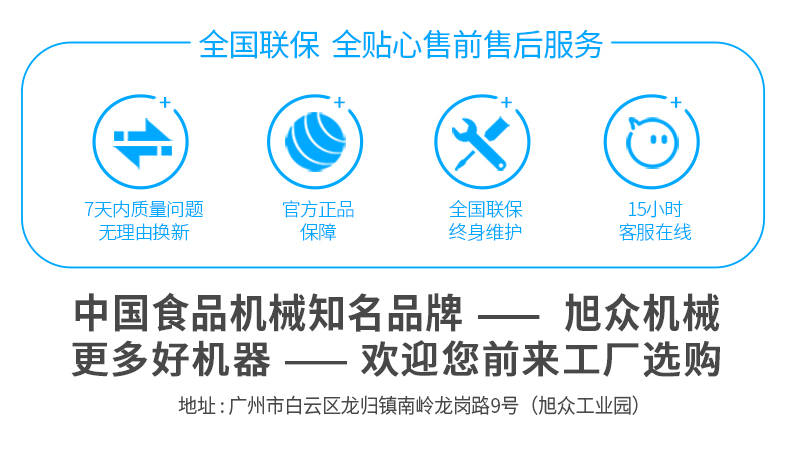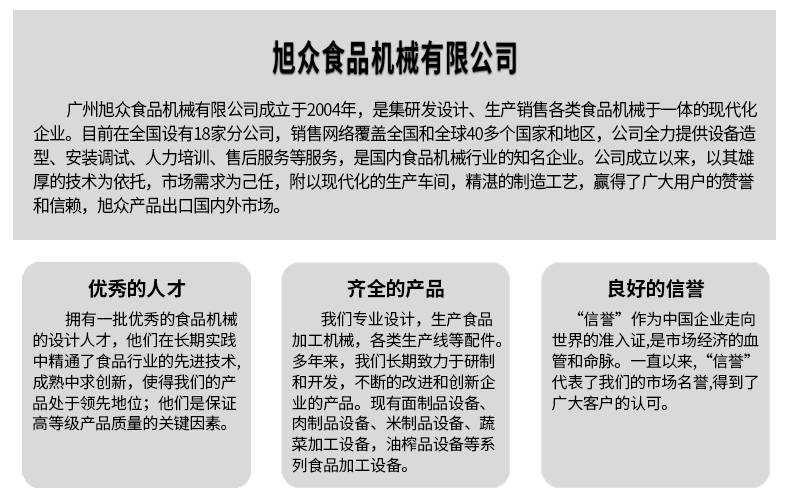 廣州旭眾食品機械有限公司是一家集科研開發(fā),生產(chǎn)設計,營銷服務為一體的現(xiàn)代化生產(chǎn)企業(yè)?,F(xiàn)代化生產(chǎn)車間,精湛制造技術,所產(chǎn)機械歷經(jīng)市場重重考驗,不斷贏得海內外客戶的贊譽。